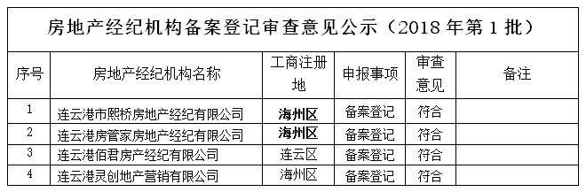 连云港市房地产经纪机构备案登记审查意见公示(2018年第1批)